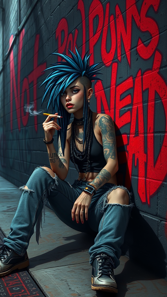 A slender punk female sitting reclined against the wall of a dimly lit alley, savoring a short cigarette. The wall behind her is emblazoned with vibrant red graffiti proclaiming "Punk's Not Dead." Her hyper-realistic, intricately detailed dreadlocks meld hues of electric blue and raven black, styled in a rebellious side mohawk. She adorns herself with layers of chunky necklaces and has tattoos sprawling across her body, each telling its own story. Piercings accentuate her nose, lip, and eyebrow, adding to her fierce demeanor. Dressed in a tattered, worn-out crop tank top and frayed, ripped jeans, she epitomizes raw edginess. The expansive, shadowy background envelops her figure, reminiscent of a Luis Royo illustration with rich, Rembrandt-like lighting. This concept art piece captures a fantastical yet gritty urban scene, with hyper-detailed and intricately sharp features that highlight her defiant spirit.