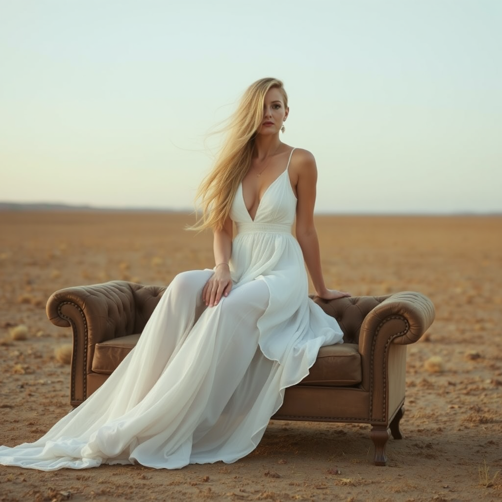A slender woman dressed in a flowing white boho dress sits gracefully atop a couch in an open, barren field. Her long blonde hair cascades around her, invoking an ethereal flowerpunk aura. Her presence is both alluring and feral, exuding a languid confidence reminiscent of icons like Lalisa Manobal and Imogen Poots. The landscape stretches desolately around her, highlighting her delicate yet striking silhouette against the vast, empty horizon.