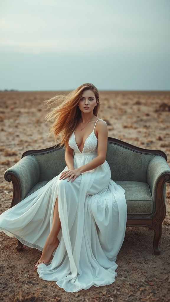 A slender woman in a flowing white boho dress sits elegantly atop a weathered couch in an expansive field. She exudes an alluring presence with long, golden-blonde hair that dances in the wind. Her appearance is a mesmerizing blend of ethereal flowerpunk and a feral, languid spirit. The barren landscape stretches infinitely around her, echoing a desolate yet captivating beauty. With a physique reminiscent of Imogen Poots and an enigmatic aura akin to Lalisa Manobal, she embodies a unique and arresting vision amidst the vast solitude.