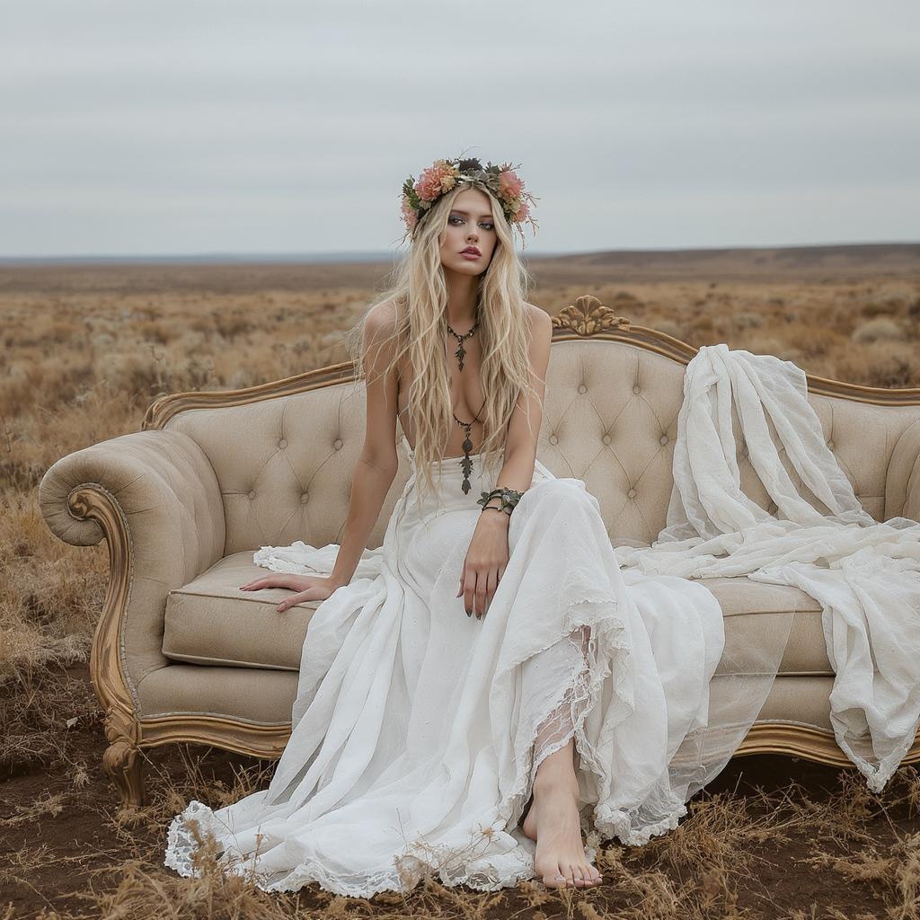 A slender woman in a flowing white boho dress sits gracefully atop a vintage couch in an open field. Her long blonde hair cascades down her shoulders, reminiscent of an ethereal flower child. With an enigmatic allure akin to Imogen Poots, she exudes a wild yet languid presence. The scene is set against a stark, barren landscape that elevates her otherworldly aura. Her demeanor is both captivating and untamed, blending the essence of Lalisa Manobal with a touch of flowerpunk mystique.
