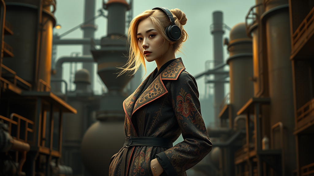 A slender woman, styled as an imperial officer in an intricately decorated open raincoat, stands with her hands in her pockets. Her loose blonde hair flows gracefully, framing a stunning face accentuated with Korean makeup. Capturing the essence of dieselpunk, she exudes an aristocratic air against the backdrop of a diesel plant. The scene is rendered with hyperphotorealism and retrospective futurism, embodying social art influences. The composition features complex details and dark tones, achieved through digital painting. In a side view, multiple light sources highlight her form, ensuring every detail comes to life. Her appearance is further adorned with tasteful accessories, including a headdress and headphones, while her hair is elegantly styled in a bun. The artwork avoids any distortions or imperfections, focusing solely on creating a beautifully detailed and realistic portrayal.