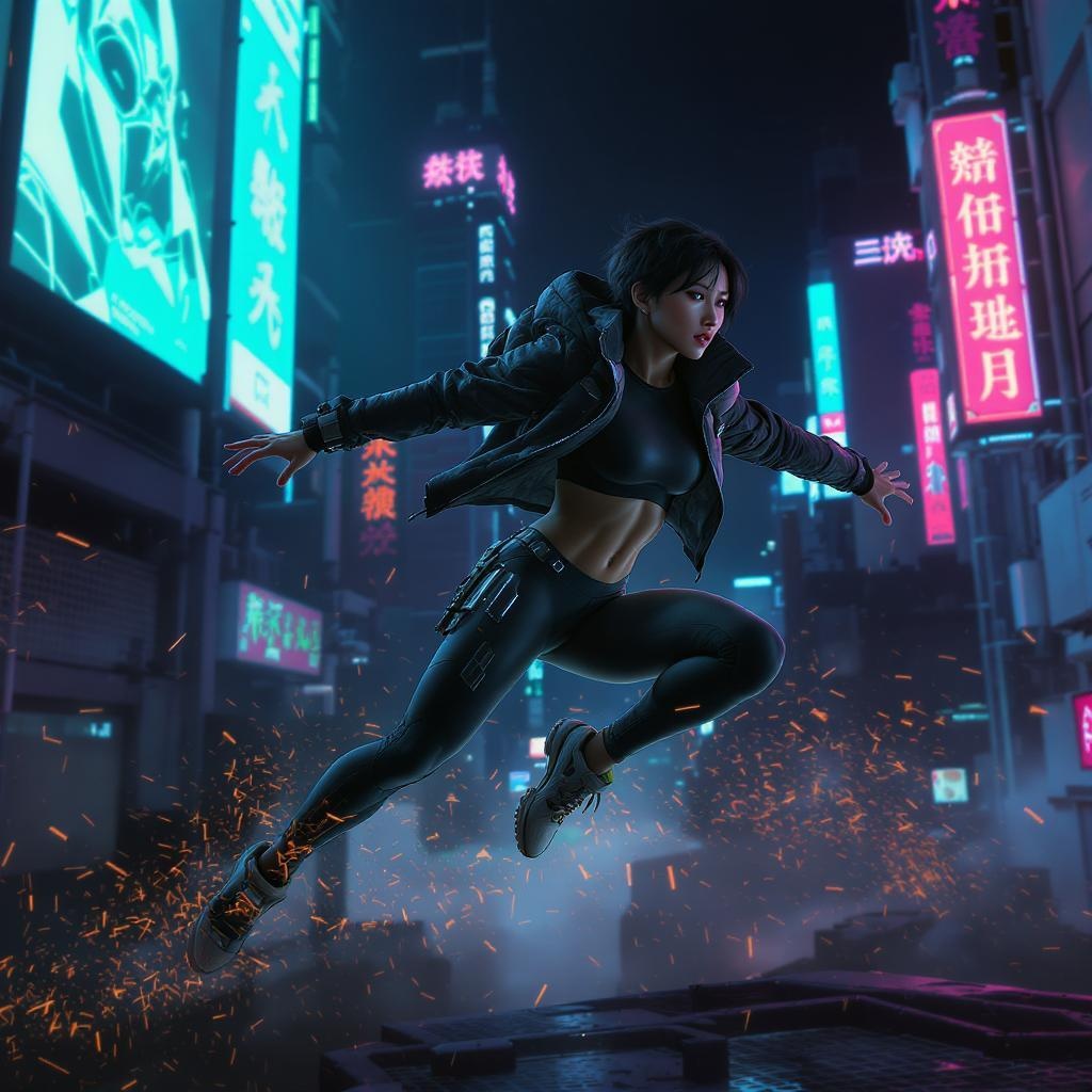 A slim, young Asian female supermodel with a flat chest and defined abs, sporting short, messy black hair, is captured mid-action in a cyberpunk video game style. She wears a sleek Nano-weapon concealment jacket, revealing her midriff, paired with advanced Biometric lockdown leggings. The scene is set against a backdrop of a Nanotech contamination quarantine zone, with neon lights casting an eerie glow. The atmosphere is vibrant, detailed, and highly futuristic, reminiscent of classic cyberpunk aesthetics. Her athletic form executes a dynamic, superhuman parkour sequence, embodying agility and grace amidst the dystopian surroundings. The digital and high-contrast style enhances the scene's intensity, drawing heavily from cyberpunk genre influences.
