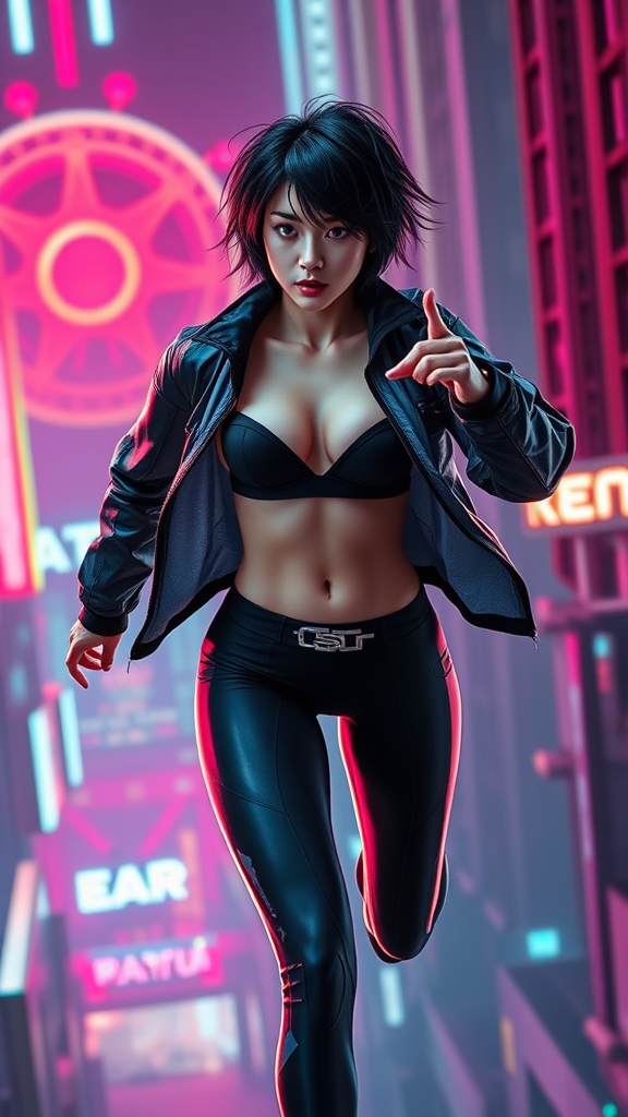 A slim, young Asian female supermodel with small breasts and a flat chest showcases her toned abs. Her short, disheveled black hair complements her agile form as she wears a Nano-weapon concealment jacket and midriff-baring attire. She moves seamlessly through a superhuman parkour sequence, navigating the neon-lit landscape. Her Biometric lockdown leggings enhance her speed and agility. In the backdrop, a Nanotech contamination quarantine zone looms, evoking a sense of dystopian unease. The scene is vibrant and richly detailed, teeming with high contrast reminiscent of cyberpunk genre video games, casting a modern, digital atmosphere.