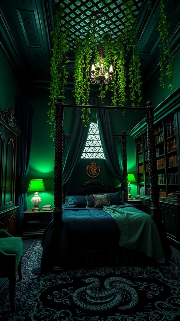 A Slytherin-inspired bedroom features dark, elegant tones with rich emerald green walls complemented by black and silver accents. The room is adorned with luxurious velvet drapes, sleek, dark wood furniture, and a grand four-poster bed draped in black and silver silk. A majestic serpent motif weaves its way through the decor, from the intricately patterned rug to the snake-shaped handles on the wardrobes. Glowing green lamps cast a mysterious, enchanting light, while a collection of ancient tomes and potion bottles line the dark mahogany bookshelves, adding to the scholarly, ambitious atmosphere. Green ivy cascades from an intricately-carved ceiling latticework, bringing a touch of nature to the opulent space.