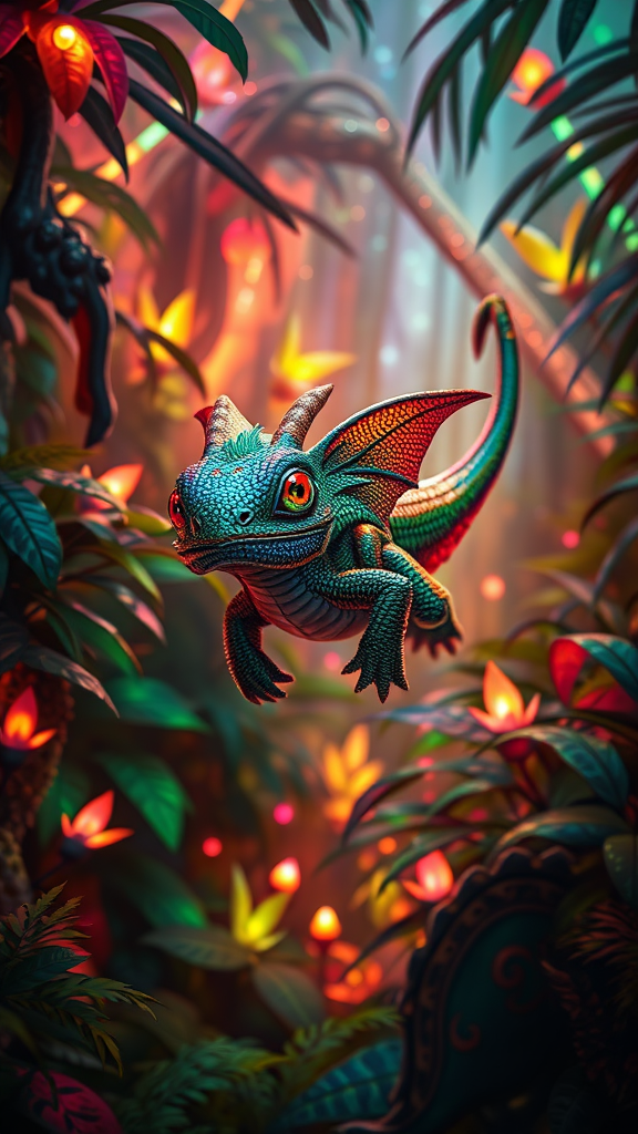 A small, adorable feathered Quetzalcoatl dragon with enchanting eyes glides gracefully through a bioilluminated jungle teeming with whimsical fantasy creatures and vibrant life. The fantastical world is adorned with intricate details, from the lush, glowing foliage to the mesmerizing play of neon diffuse light. Iridescent colors shimmer across the dragon's scales, reflecting the rich heritage of an Aztec civilization woven into the landscape. The scene is captured in a stunning octane render, bringing this enchanting vision to life with soft uplight and a sense of wonder.