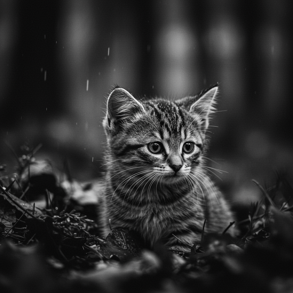 A small, adorable kitten nestled in a rainy forest setting, captured in a character portrait with a tilt-shift effect and bokeh background. The image is in black and white, featuring quirky, whimsical art with poorly drawn elements, incorrect anatomy, an extra or missing limb, and charmingly endearing imperfections.