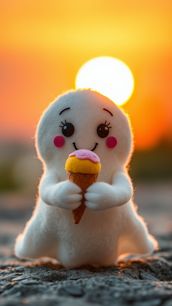 A small and endearing felt ghost with a round, cuddly physique is gently holding an ice cream cone in its tiny hands, its eyes sparkling with joy as it gazes directly at you, a wide and joyful smile spread across its face. Its presence is so charming that it effortlessly melts the toughest of hearts. The rising sun bathes everything in a warm, golden light, enhancing the whimsical aura around the ghost. The soft textures of the felt contrast beautifully with the vibrant colors of the sunrise, creating an atmosphere of pure love and delight. In this serene moment, smiles and warm feelings abound, enveloping the scene in a tender embrace that feels both magical and heartwarming.