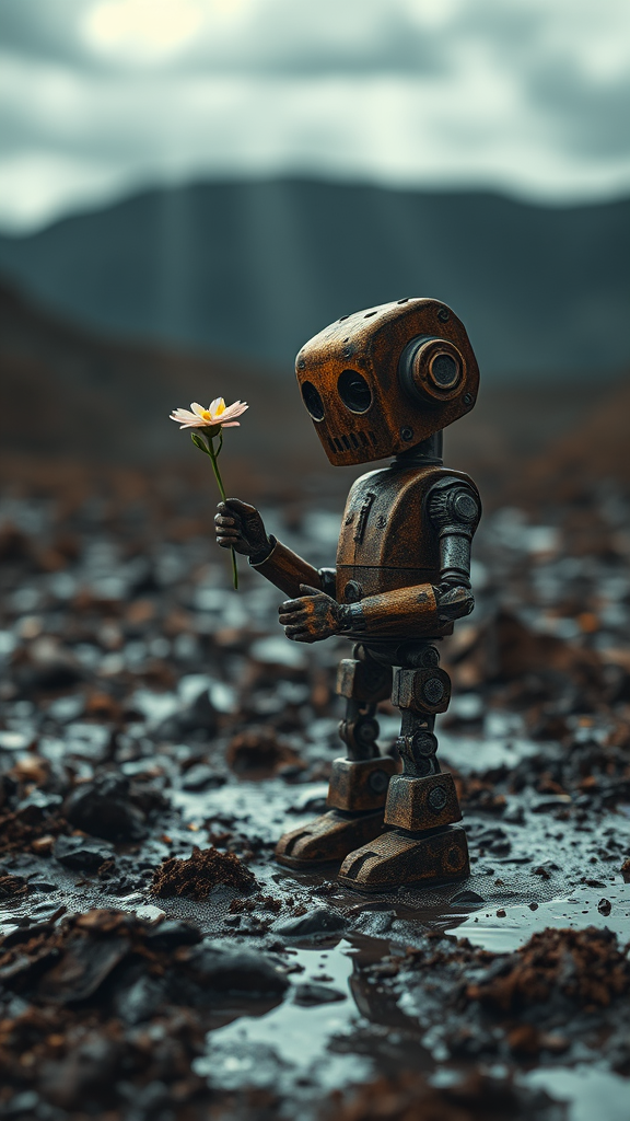 A small, rusted robot stands amidst a barren landscape, clutching a delicate flower in its grasp. The scene is bathed in cinematic lighting, with dramatic volumetric rays piercing through the dense, overcast sky. The ground is soaked and slick with dripping mud, adding a moody, melancholic aura to the moment. The robot's eyes reflect a glimmer of hope and curiosity as it admires the fragile bloom in its hand.
