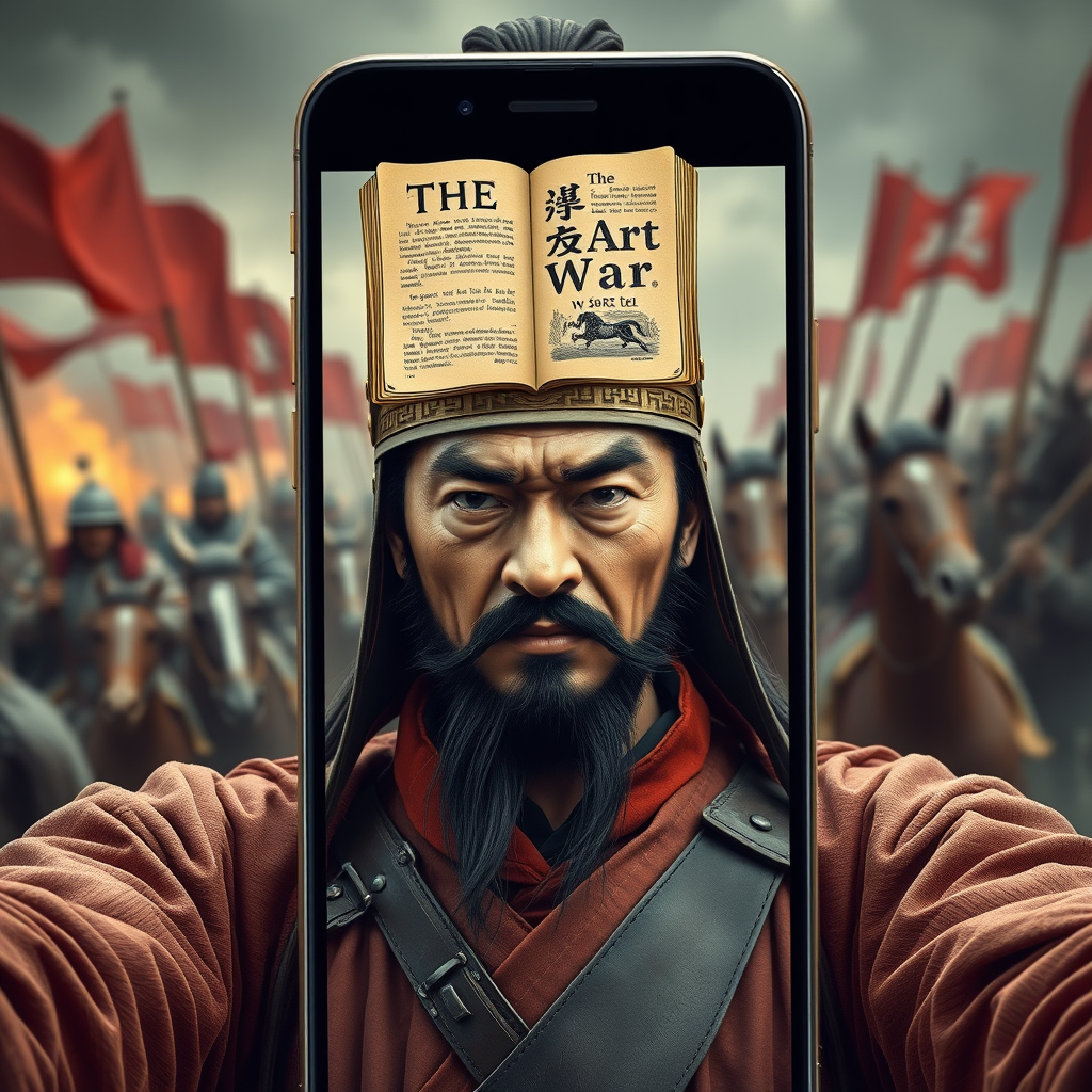 A smartphone screen shows a distorted selfie of Sun Tzu, the legendary Chinese military strategist, standing amidst a chaotic battle scene, his face a blur of sweat and focus, with ancient Chinese armor and horses speeding by in the background, while a stylized illustration of The Art of War's opening pages float above his helmet