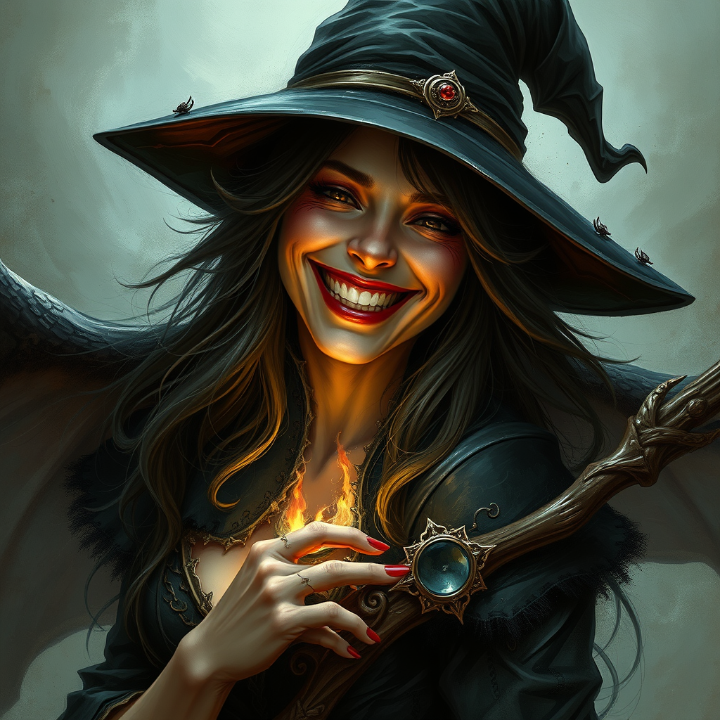 A smiling witch in a stunning scene of vengeance, inspired by Eledrae and Taijen 3, captured in the style of Alberto Vargas, showcasing a polished metamorphosis, rich with trompe l'œil illusionistic detail. Embracing elements of stripcore, this dreamlike composition blends otherworldly and mystical realism. The ultra-detailed, abstract yet representational artwork is realized through Adobe Photoshop, reflecting an inspired, artistic creation worthy of acclaim.