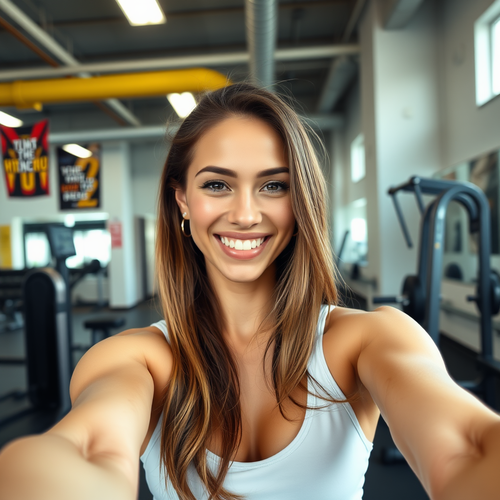 A smiling young woman taking a selfie in a bright, energetic gym, showcasing her determination and confidence, with motivational posters on the walls and exercise equipment visible in the background, her expression radiating positivity and strength.