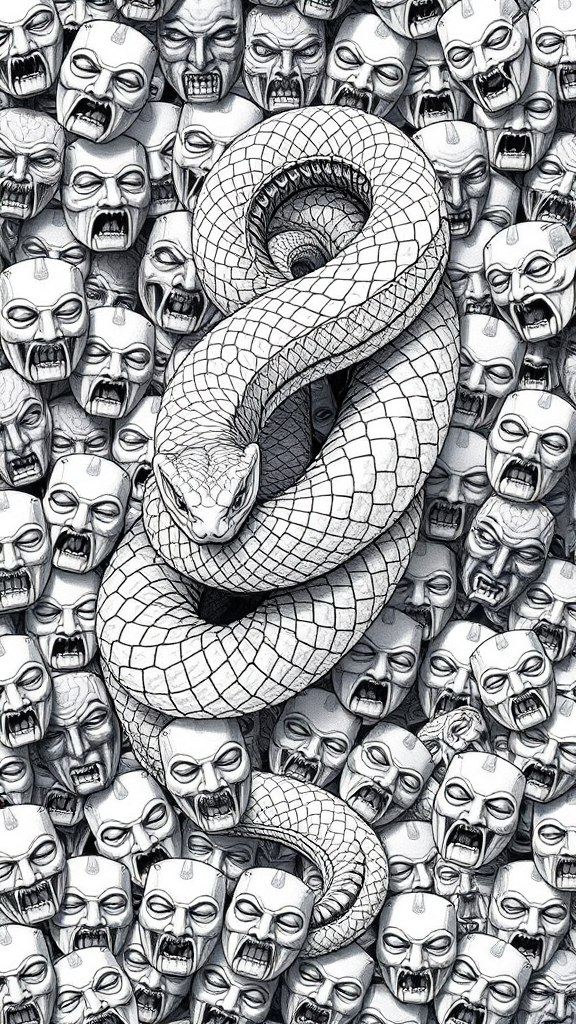 A snake entwined in black and white pencil drawings, surrounded by a cascade of countless intricately detailed Japanese masks, each with lifelike details and expressions, creating an enigmatic and mesmerizing atmosphere.