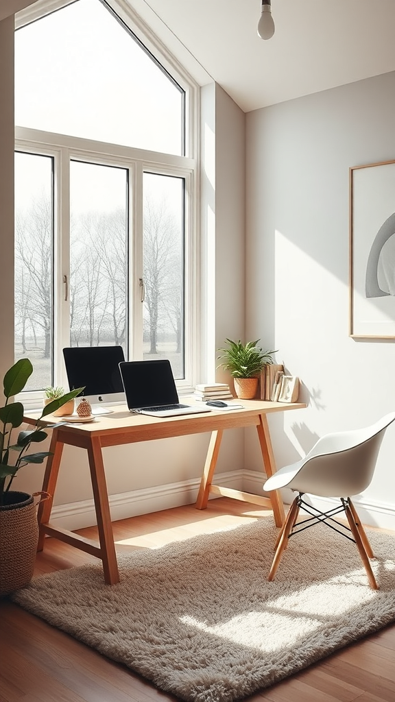 A snug Scandinavian home office featuring a natural oak desk, bathed in ambient light from an expansive floor-to-ceiling window, captured from a low angle to accentuate the airy and open feel. The scene is ultra-realistic with meticulous attention to detail, blending studio lighting with soft sunlight. A plush rug adds warmth underfoot, while a selection of minimalist Scandinavian decor pieces complement the soothing palette. The atmosphere is serene, inviting creativity and focus, with a hint of greenery from a potted plant nearby.