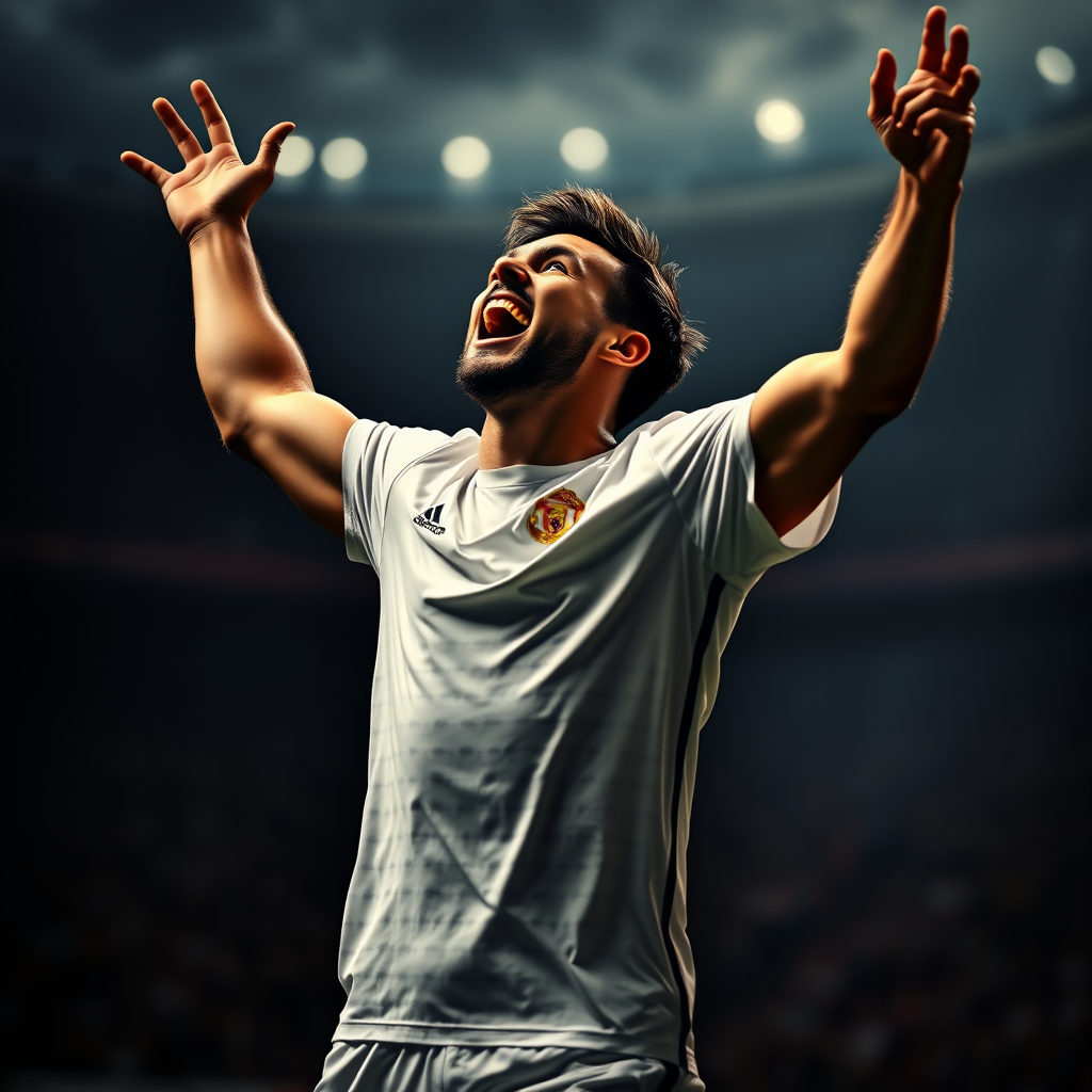 A soccer player exults exuberantly after scoring a goal, adorned in a pristine white jersey that simmers under the contrasting chiaroscuro lighting reminiscent of Caravaggio's opus. Shadows play dramatically across his muscular form, capturing the raw emotion etched into his ecstatic expression. His face is a mosaic of triumph, eyes alight with fiery intensity, and his arms are flung heavenward in a gesture that seems to transcend the earthly realm. The background, a blurred flurry of darkened spectators and tempestuous skies, further accentuates the luminous vigor of the athlete’s victorious moment, encapsulating the tension of both struggle and success.