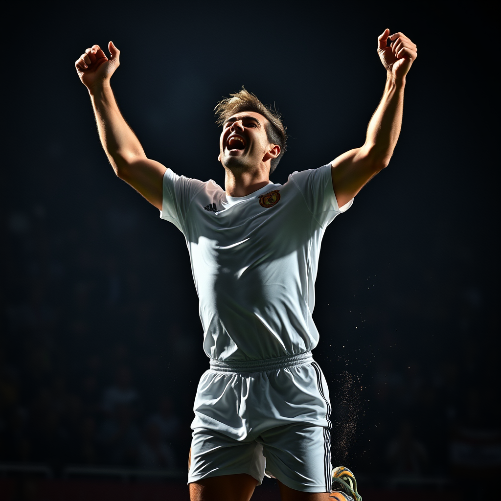 A soccer player exults in triumph, bathed in dramatic chiaroscuro light reminiscent of a Caravaggio masterpiece. His white jersey clings to his athletic frame, accentuating the powerful muscles beneath, as he leaps into the air with arms raised in exultation. Shadows play across his determined face, capturing a moment of pure jubilation and intensity. The crowd in the background is a blur of motion, their expressions of awe and admiration slightly out of focus, highlighting the player's vivid presence at the center of the action. Dust and small particles catch the light, suspended in the air as if time itself has paused to celebrate the goal with him.
