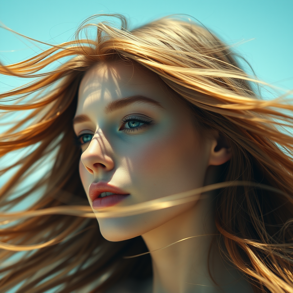 A soft and dreamy close-up of a woman with long flowing hair billowing in the wind, captured in a hyper-realistic pop-inspired style. Her features are gently detailed, with sky-blue and warm brown tones blending seamlessly into the background. The scene has an animated quality, reminiscent of a dynamic gif, with elements that evoke the photographic touch of Mario Testino. The overall atmosphere is serene yet vibrant, inviting the viewer to dwell in the subtle interplay of wind and water, a moment suspended in time.