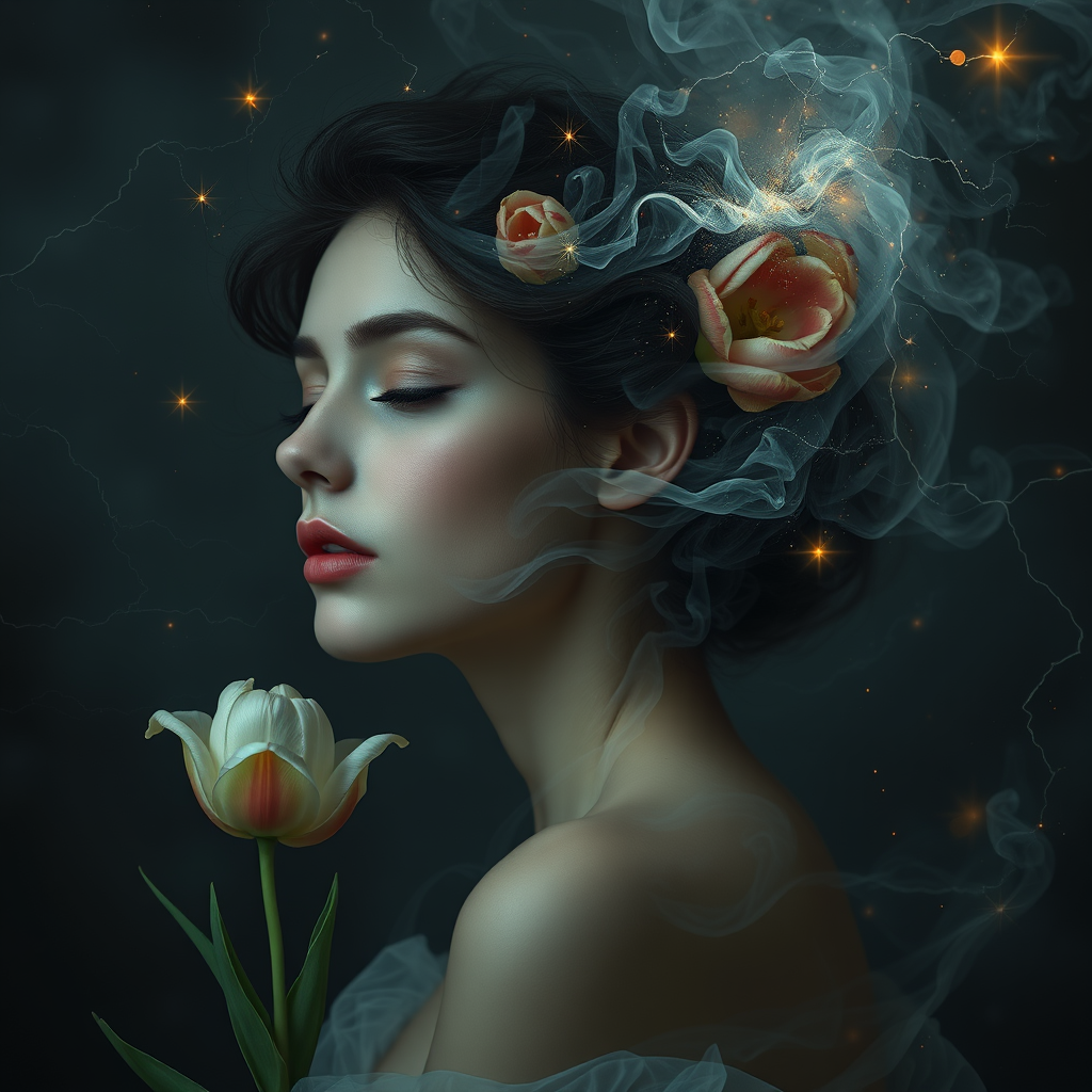 A soft, ethereal woman with tulips gently blooming in her hair, surrounded by swirling galaxy smoke fractals, embodies elegant botany and dynamic movement. Sparkling stars and flickering lightning embers illuminate the moody night-sky background. The scene, reminiscent of the works of Raphael, Caravaggio, and Bastien Lecouffe-Deharme, captures a surreal, dreamy essence, hauntingly beautiful in its execution. The overall atmosphere is both enchanting and mysterious, with a raw, evocative style.
