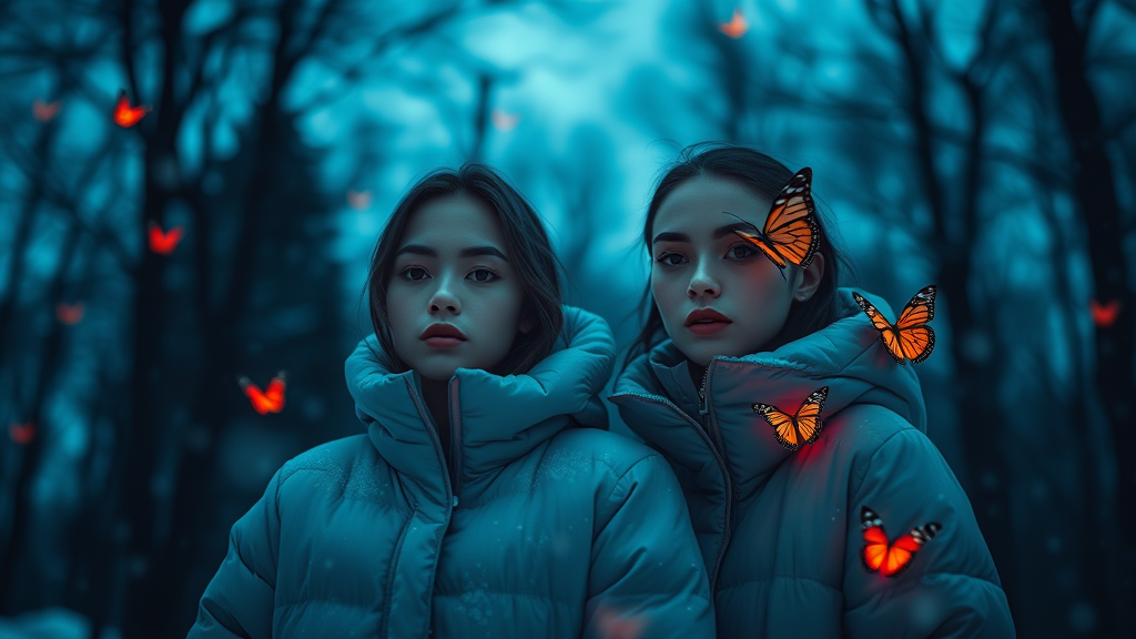 A softly blurred image of a snowy winter puffer jacket fashion scene, set at night beneath a surreal sky alive with change and wind, dominated by deep shades of red and blue. Realistic butterflies glow subtly in the shadows of a dark forest, embodying minimalist beauty. An androgynous, cosmopolitan energy pervades, with serene faces highlighted in a light black, cold palette. The figures are loose and fluid, amidst ethereal abstractions, wrapped in a sense of serene chaos and quiet mystery.