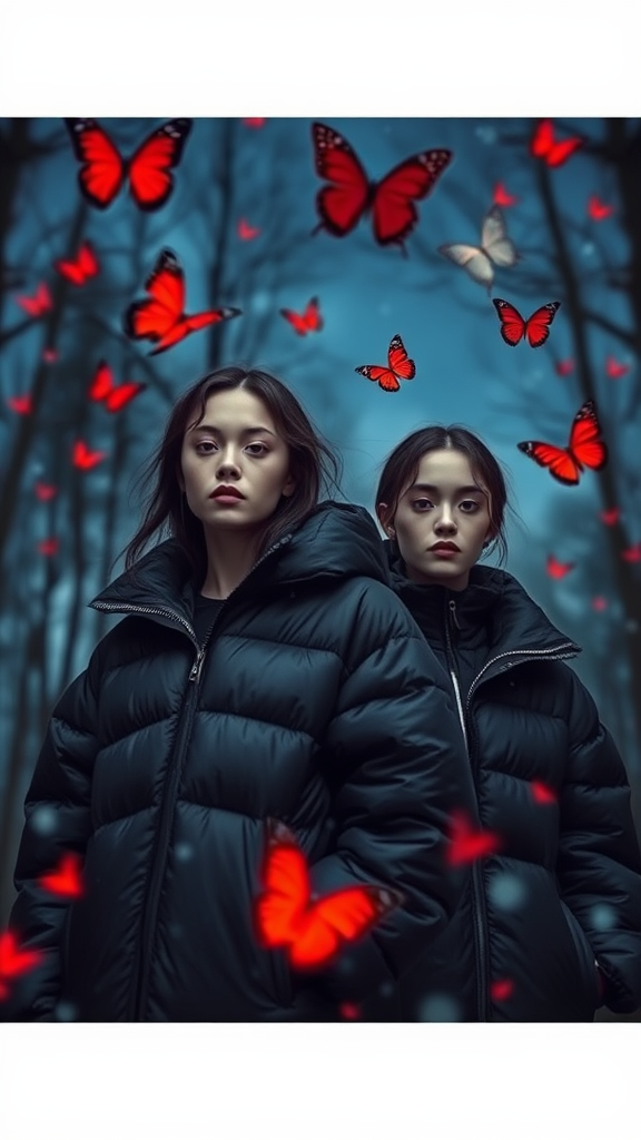 A softly blurred image of winter fashion featuring puffer jackets, set against a surreal night sky swirling with elements of change and breezy hues of deep red and cool blue. The scene is gently illuminated by realistic butterflies casting a soft glow in a shadowy forest. The style is minimalist, highlighting androgynous forms with a light black, cold color palette, exuding a cosmopolitan vibe. Faces appear serene, with garments flowing in loose, fluid movements and ethereal abstractions, injecting a sense of chaos and order.