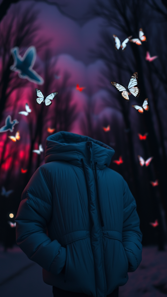 A softly blurred night scene captures a snowy winter puffer jacket fashion against a surreal sky, where winds of change swirl amidst red and blue hues. Gently glowing realistic butterflies dance through a shadowy forest, embodying minimalist beauty and an androgynous allure. The scene's light black, cold palette reflects a cosmopolitan energy, with serene faces emerging from loose, fluid forms and ethereal abstractions, hinting at an underlying chaos.