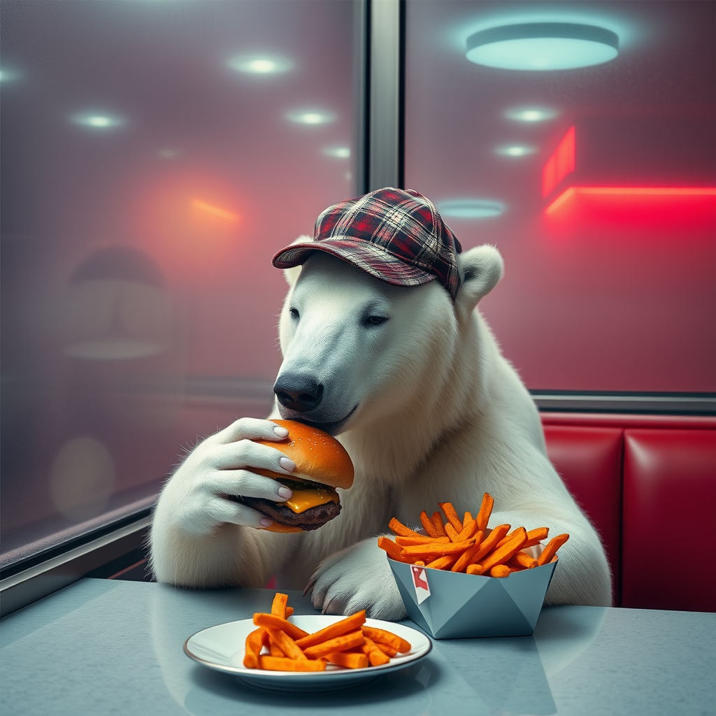 A solitary and melancholic polar bear, donning a vintage plaid baseball cap, silently savors a cheeseburger and crispy sweet potato fries by the fogged window of an empty retro diner in New York City, captured in vibrant colors and striking contrast by the renowned photographer Miles Aldridge.
