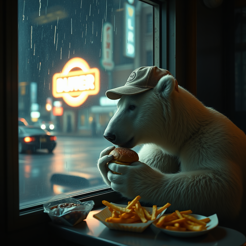 A solitary and melancholic polar bear donning a vintage baseball cap is seated by the window in a dimly lit, nearly abandoned cafe diner in New York. The bear is slowly nibbling on a burger, with a side of crispy fries on the table. Outside, the city that never sleeps seems strangely still, highlighted by the neon glow from a flickering sign. Photographed with a cinematic flair reminiscent of Miles Aldridge, the scene captures the poignant contrast between the urban backdrop and the bear's solitary existence. Rain begins to drizzle down the window, blurring the city lights and adding a touch of melancholic beauty to the moment.