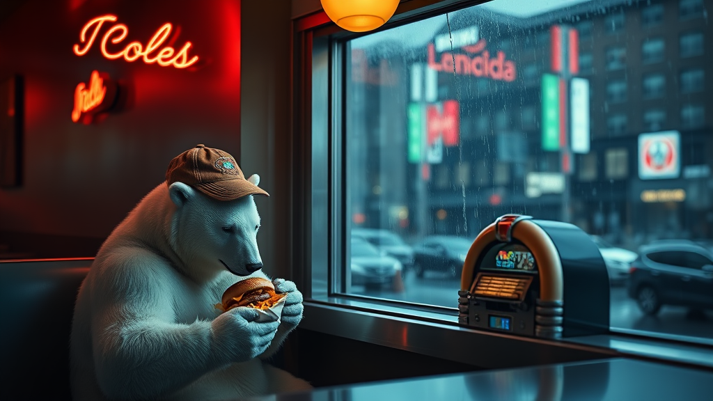 A solitary and melancholic polar bear donning a vintage baseball cap sits in a dimly lit corner of a deserted 1950s-style diner in New York, thoughtfully munching on a hamburger and fries. The large window next to him frames a rainy cityscape, with droplets streaking down the glass. The interior, bathed in the neon glow from an old jukebox, has a nostalgic atmosphere. Photographed in the cinematic style of Miles Aldridge, the scene captures a poignant mix of whimsy and introspection.