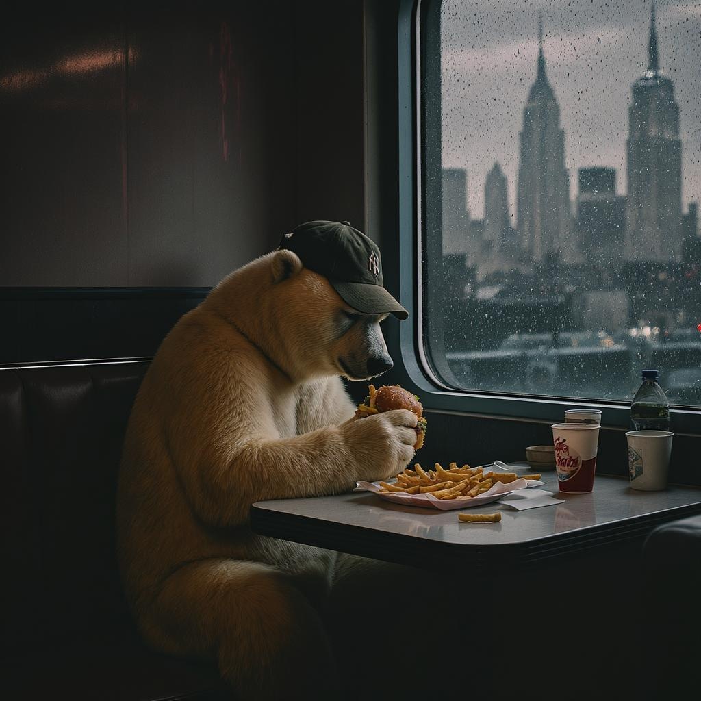 A solitary and melancholic polar bear donning a weathered baseball cap sits in a dimly lit corner of an empty New York City diner, the urban skyline ghostly in the rain-drenched window beside him. He's thoughtfully consuming a classic American meal of a hamburger and crispy fries, the vibrant colors of the food contrasting with the muted, vintage tones of the setting. The scene is captured in the distinctive style of Miles Aldridge, with his signature cinematic flair, capturing the bear's introspective gaze and the hauntingly quiet atmosphere of the diner.