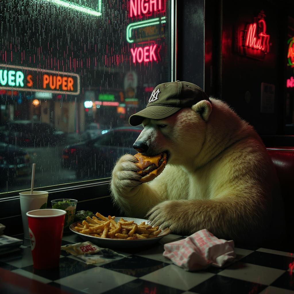 A solitary and melancholic polar bear, donning a worn baseball cap, sits in a dimly-lit, vintage New York diner. The polar bear munches on a cheeseburger and fries, gazing out the rain-streaked window. The diner, with its retro checkered floors and neon signs softly flickering, adds to the surreal atmosphere. The scene is captured in the vibrant, cinematic style of a Miles Aldridge photograph, highlighting the stark contrast between the bright colors of the meal and the somber mood of the bear.