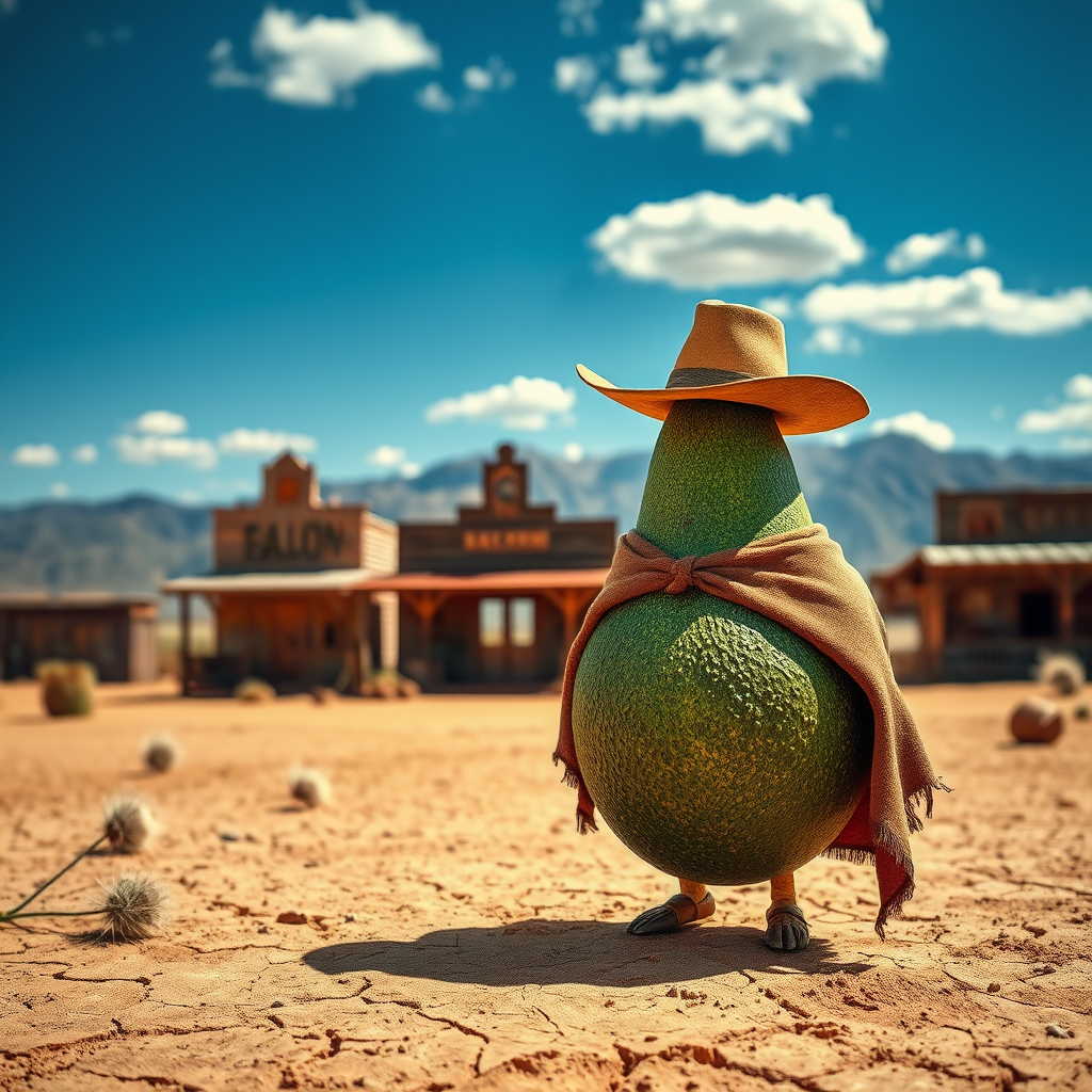 A solitary avocado desperado stands in a dusty wild west town, wearing a tattered cowboy hat and a frayed poncho, its textured green skin glistening under the harsh desert sun. The scene captures the intricate details of its rugged surface, accentuating the avocado's rich, creamy color. In the background, wooden saloon doors swing gently in the wind, while tumbleweeds drift across the cracked earth. A distant mountain range looms under a vivid blue sky, creating a striking contrast that highlights the hyper-realism of this 8k photographic image. Sparse clouds add depth to the expansive horizon, giving the entire scene a lifelike, timeless quality.
