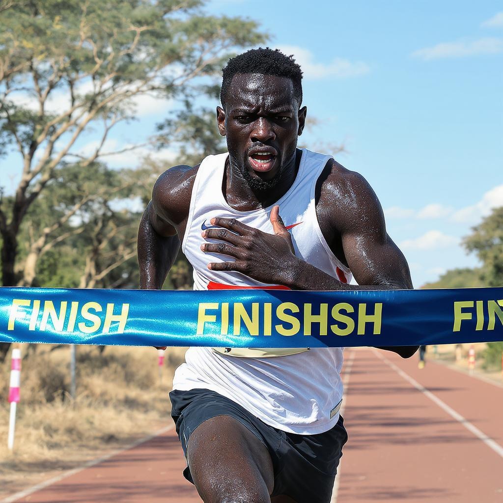 A solitary black African runner, exhausted yet determined, bursts through the azure finish line ribbon with his chest, his sweat-drenched white jersey glistening under the afternoon sun.