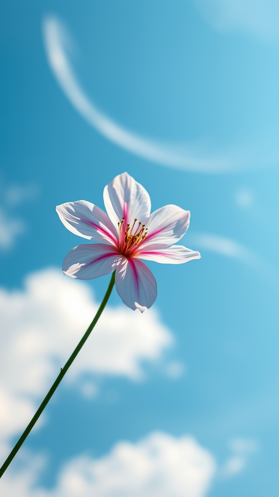 A solitary bloom against a vast blue sky adorned with delicate cloud wisps, captured in the style of Miki Asai's macro photography. This close-up shot is hyper-detailed and trends on ArtStation, showcasing sharp focus with studio quality. The intricate and highly detailed image channels the artistic essence of Greg Rutkowski. The scene is both serene and captivating, with subtle variations in color and texture highlighting the beauty of nature.