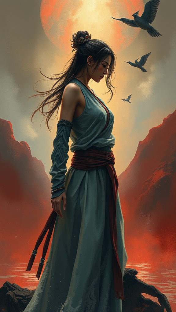 A solitary character stands on a mysterious island, surrounded by a dark bronze and red landscape. The scene is crafted with luminous brushwork, capturing intense close-ups that reveal intricate emotions. The figure embodies a blend of womancore aesthetics, juxtaposing strength and grace. Traditional techniques enhance the timeless feel, with an underlying sense of irony woven into the scene. The air is thick with an atmospheric glow, highlighting the character's reflective gaze, as the elements around them convey a story of solitude and resilience.