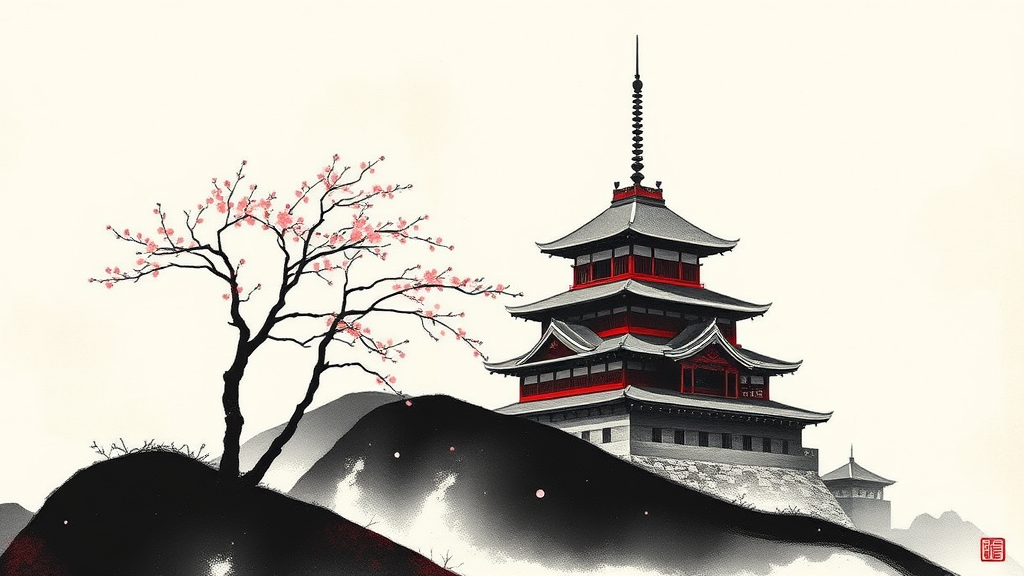 A solitary cherry blossom stands on a hill, its delicate petals gently swaying in the breeze. Behind it, a majestic Japanese castle looms, its architecture stark and regal in shades of black and crimson. The scene is reminiscent of an ancient scroll painting, where the simplicity of sumi-e drawing captures the essence of minimalism, embodying tranquility and timeless beauty, evocative of Luis Royo's artistry.