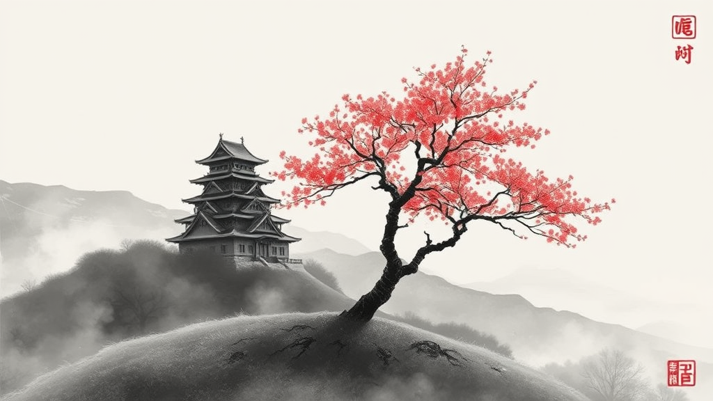 A solitary cherry blossom tree atop a gentle hill overlooks a distant Japanese castle, adorned in shades of black and crimson. The scene captures the essence of minimalism, akin to a traditional scroll painting with delicate sumi-e brushwork, evoking a sense of quiet elegance and timelessness, inspired by the mystique of Luis Royo.