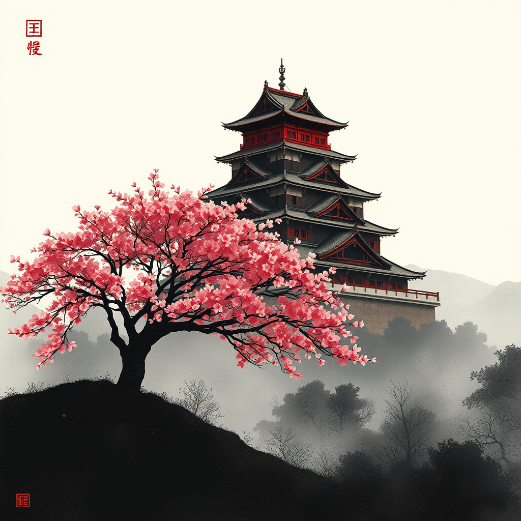 A solitary cherry blossom tree graces a hill in the foreground, with a majestic Japanese castle looming behind, adorned in striking black and crimson hues. The scene is reminiscent of a scroll painting, rendered in a minimalist sumi-e style with a touch of Luis Royo's atmospheric influence, yet void of any human presence.
