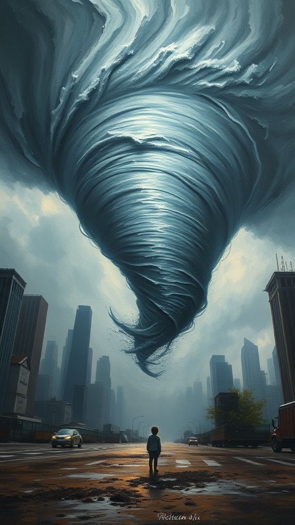 A solitary child standing amidst a scene of melancholy, captured in a sweeping oil painting. A colossal, swirling tornado rages through the cityscape, its destructive power evident in an ultra-wide shot. The natural disaster is depicted with cold, somber colors that heighten the emotional gravity. The composition is epic and grand in proportion, an awe-inspiring masterpiece that conveys both beauty and devastation. An award-winning achievement, rendered in stunning HD, showcasing every minute detail in 64K resolution.