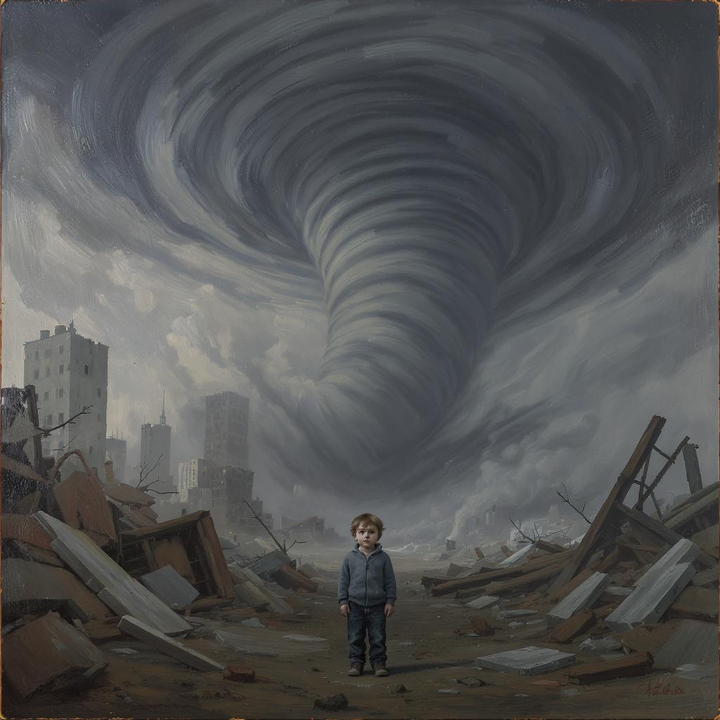 A solitary child stands amidst a scene of profound melancholy, captured in an oil painting that depicts a massive swirling tornado ravaging a cityscape. The ultra-wide composition showcases the immense scale of the disaster, with cold hues emphasizing the atmosphere of destruction. The epic proportions of the swirling vortex add a sense of awe to the masterpiece. This award-winning artwork, rendered in stunning high definition, captures the raw power and emotion of a natural disaster.