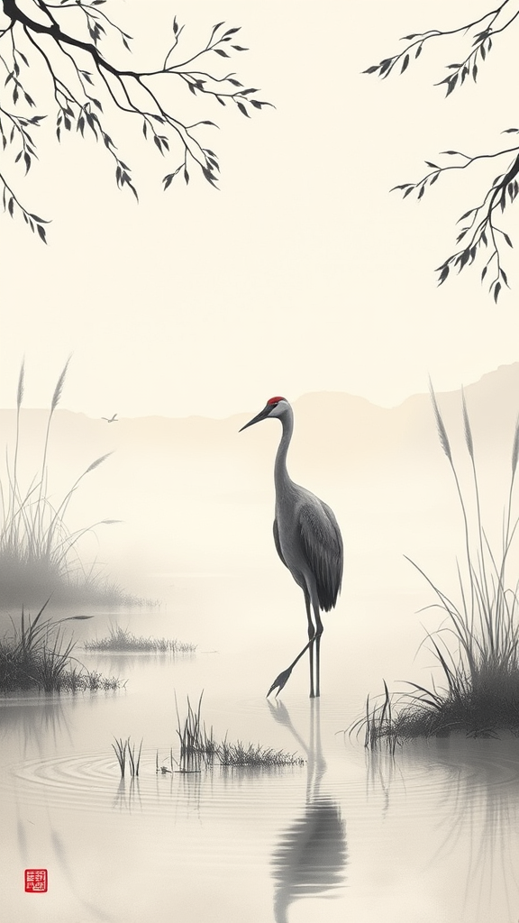 A solitary crane stands gracefully amidst a mist-shrouded marsh, its elegant form captured in the subtle gradients of ink wash painting. The delicate interplay of light and shadow highlights the serenity of early dawn, with soft silhouettes of distant reeds and willow branches framing the scene. The gentle ripples on the water mirror the calm sky, as a faint breeze stirs the tranquility, evoking a sense of timelessness and introspection in the tranquil landscape.