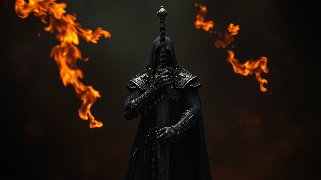 A solitary dark soul stands resolutely, gripping a formidable greatsword pointed downwards. The scene is dichromatic, with intricate details emerging against a deep black backdrop. Flames dance fervently, echoing the intensity of the Flame Temple. The fire effect, rendered in 16k UHD HDR, captures every flicker and blaze with stunning absurdres. The atmosphere is surreal, teetering onto the edge of the bizarre, with elements of duplication and distortion; faces appear split, eyes crossed, necks elongated, and hands sprout extra fingers. Despite the chaotic mutations and disfigurements, the essence of darkness and power prevails. The image retains clarity and focus, avoiding low-resolution artifacts, out-of-frame elements, or visual distractions like watermarks, logos, text, and split images. Creativity seeps through subtle alterations, yet the core intensity remains unyielding and captivating.