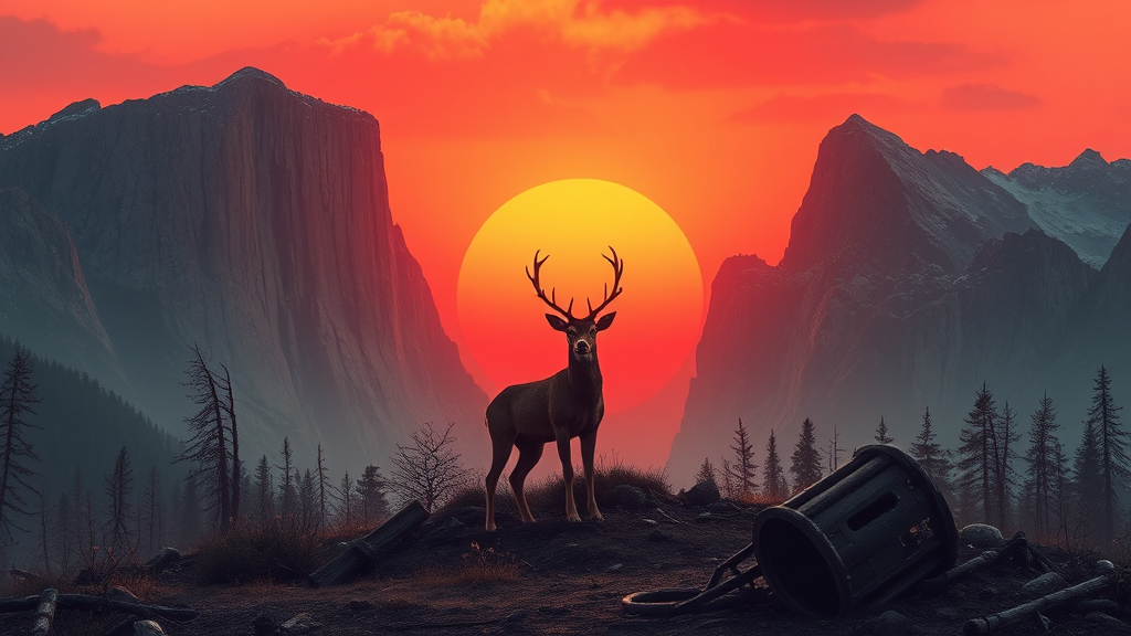 A solitary deer stands resilient amidst the towering, majestic mountains under a crimson sunset, where nature and forgotten human relics blend in a post-apocalyptic world, and eerie shadows of zombies lurk silently in the echoes of a once-thriving civilization.