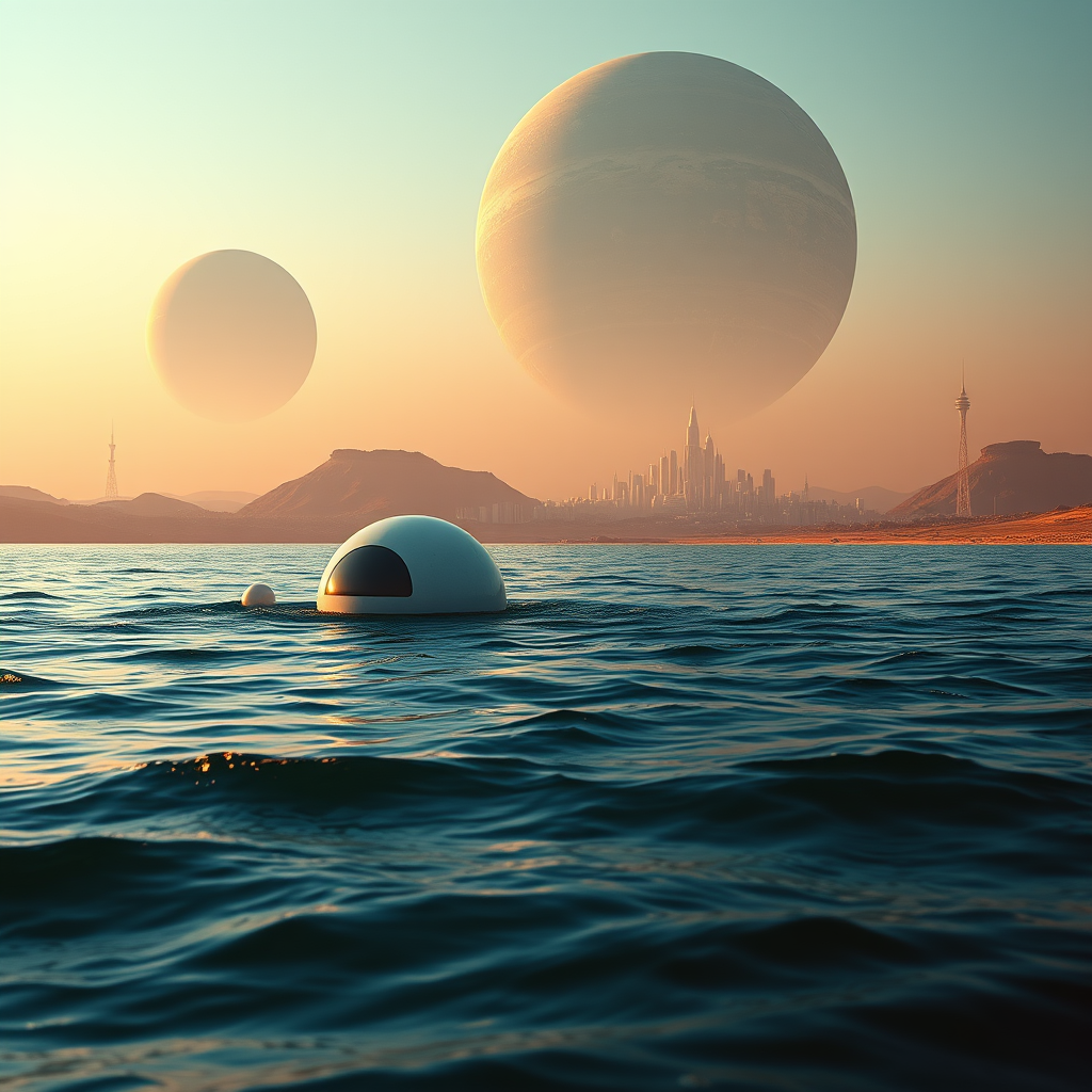 A solitary, dome-shaped object emerges from the serene waters, embodying sci-fi artistry with a tonalist palette of soft oranges and subdued crimsons. The scene is gently illuminated by natural light, captured with the precision of a Samyang AF 14mm f/2.8 RF lens. Set against a romantic desertpunk backdrop, the image features hyper-realistic details in breathtaking 32k UHD, creating a digital masterpiece. In the distance, a verdant city rises, interspersed with the silhouettes of distant planets, reminiscent of beautifully eroded interiors painted in light red and orange hues. The environment evokes an Australian landscape, as if viewed through the lens of a Nikon D750. This transfixing marine scene captivates with its ultra-realistic, hyper-detailed rendering, crafting a fantastical yet believable world, captured in 32k UHD.