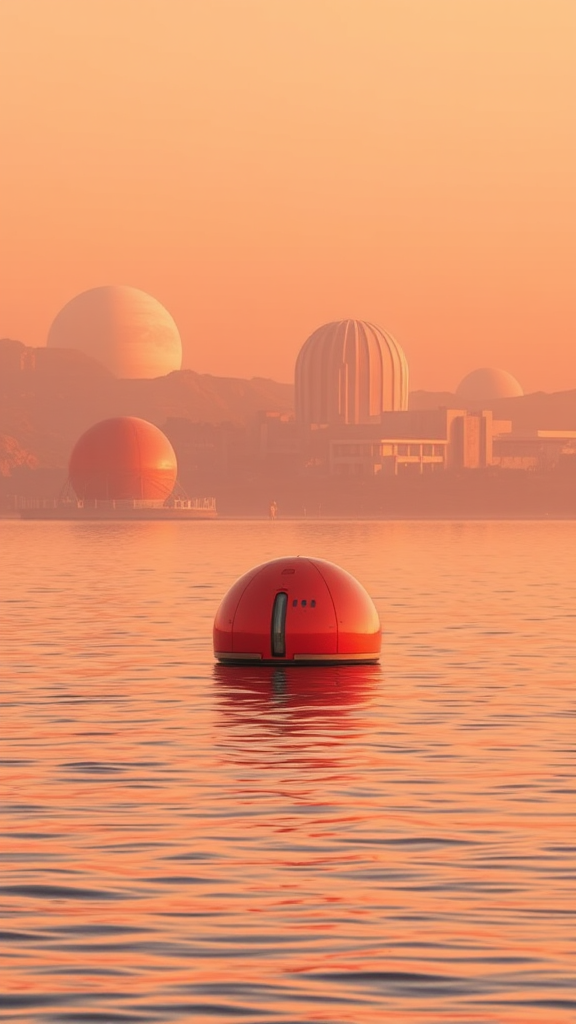 A solitary dome-shaped object floats serenely in the water, captured in a science fiction art style with a tonalist color palette of soft orange and gentle crimson, bathed in natural light. The setting transforms into a romantic blend of desertpunk and hyper-realism, rendered with stunning detail in 32k uhd, a true digital masterpiece. In the background, a verdant cityscape rises amidst otherworldly planets, evoking the essence of eroded interiors, draped in hues of light red and warm orange. The scene unfolds against an austere Australian landscape, as if photographed with a Nikon D750, capturing transfixing marine vistas. The depiction remains a realistic, hyper-detailed rendering, blurring the lines between fantasy and reality, embodying the quintessence of enchanting digital art.