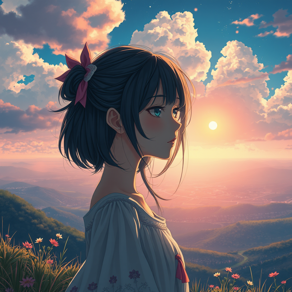A solitary ethereal girl stands serenely on a hillside, her mesmerizing face exquisitely detailed, capturing the essence of anime style. The scene unfolds into a key visual masterpiece with intricate and breathtaking details, vibrant hues painting a panoramic view. The composition evokes a cinematic grandeur reminiscent of Carne Griffiths and Conrad Roset's artistry, with a touch of Studio Ghibli's enchanting atmosphere, radiating beauty and imagination.