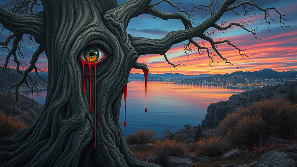 A solitary eye embedded within the bark of a gnarled tree, looming over a tranquil lakeside, painted in the distinctive style of Brian Despain. The eye drips with vibrant paint, creating rivulets that cascade down the tree’s trunk, merging with the reflective water below. Surrounding this scene is an expansive, hyper-detailed landscape that seamlessly blends surrealistic urban elements with the natural world, reminiscent of the intricate and imaginative worlds of Mati Klarwein and Mars Ravelo. A cityscape in the distance blends into the horizon, melding with the vivid hues of a twilight sky, evoking a dream-like atmosphere.