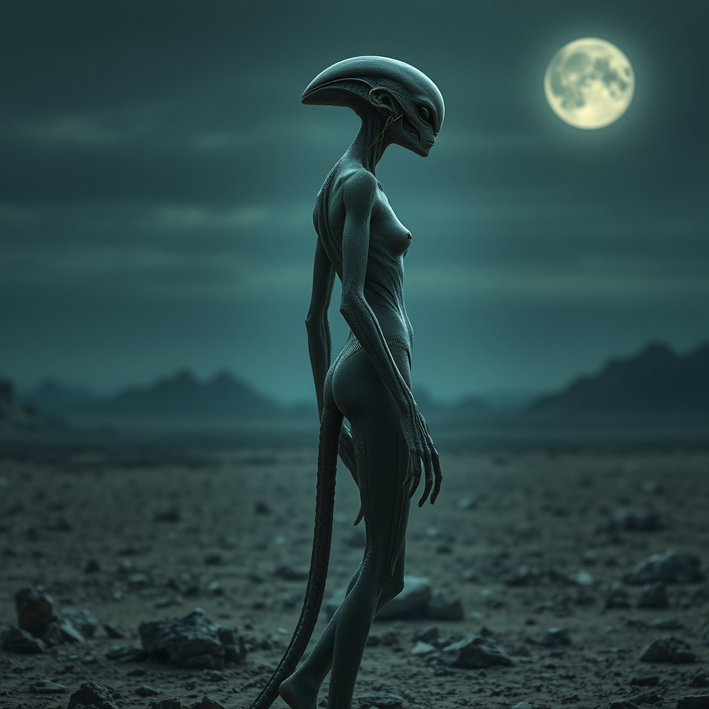 A solitary female alien viewed from the side, showcasing her entire body with an emphasis on realistic detail, her skin textured and gritty, standing against a stark, barren landscape under a dimly lit sky. Her elongated limbs and bioluminescent patterns subtly glowing, offering a stark contrast to the rugged terrain around her. The air is heavy, hinting at an otherworldly atmosphere, as if capturing a moment of serenity and resilience in this alien world.