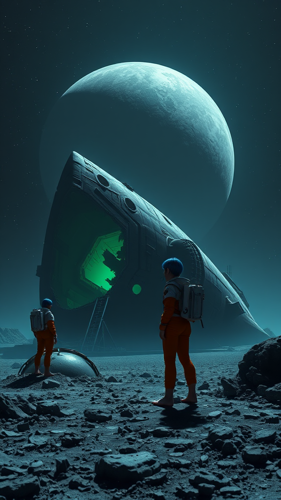 A solitary female astronaut with striking blue short hair and barefoot, dressed in an orange leggings space suit, gazes at the void from her perch beside a colossal, derelict spaceship that lies marooned on a barren, rocky planet. The craft, shadowy and angular, exudes a faint green luminescence from its wrecked interior, where jagged holes in the hull reveal glimpses of the mysteries within. The backdrop is a somber expanse with scarce stars, accentuating the immense emptiness and solitude. The scene is infused with an aura of enigma, awe, and a hint of peril, hinting at a locus of formidable power or an ancient calamity. The palette is dominated by shades of deep blue, black, and muted greens, with intricate textures bringing the spaceship and planetary surface to life. The vastness is underscored by the presence of a behemoth planet looming in the dark sky, its silhouette adding to the depth and atmospheric perspective of the tableau.
