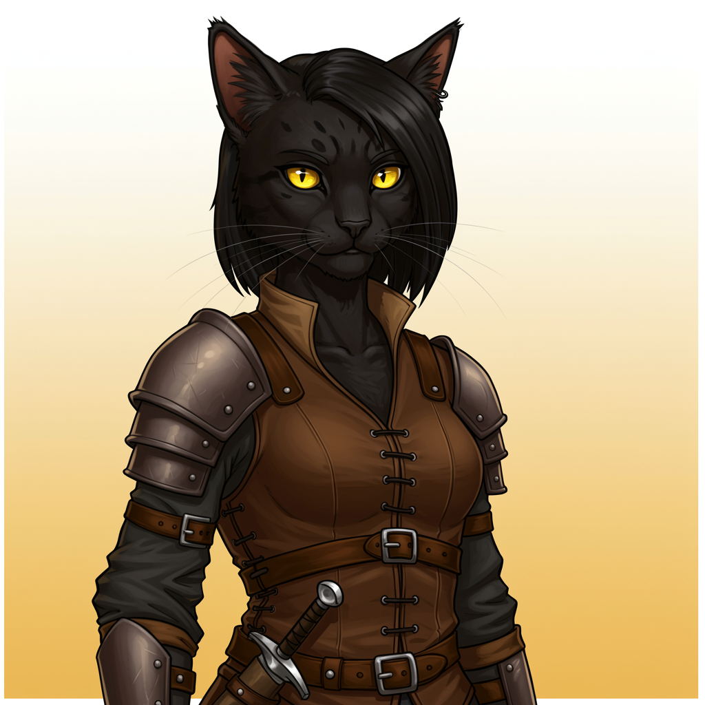 A solitary female tabaxi with sleek black fur and piercing yellow eyes stands confidently, embodying the essence of a cat girl with her distinct animal nose and alert ears. She wears rugged leather armor that hints at her rogue thief persona, and the cowboy shot captures her agile stance. The scene is accentuated by warm hues of yellow and white, contrasting beautifully with her dark fur. The simple background ensures the focus remains on her feline grace and enigmatic presence as she surveys her surroundings with a hint of mischief.