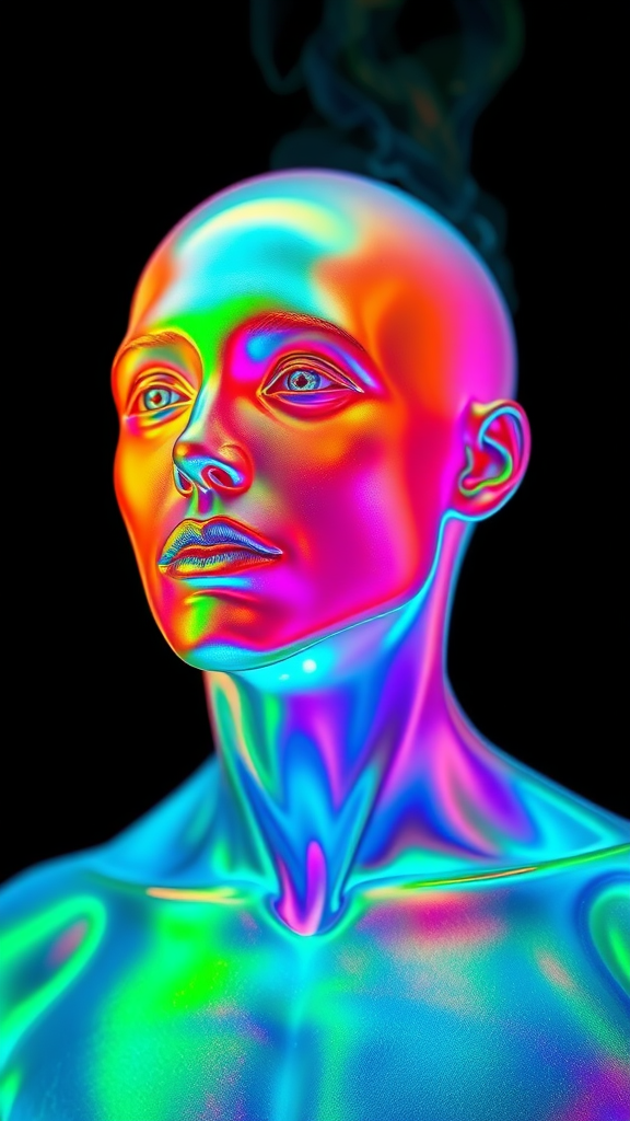 A solitary figure, engulfed in a psychedelic bioluminescent aura with a vivid color palette of orange, pink, green, and captivating blue hues, forms a multicolored rainbow portrait reminiscent of the styles of Moebius, Beksinski, and Spitzweg. The protagonist's skin shines with an iridescent, oil-on-water effect, as if a liquid rainbow cascades over the melting form of a silver surfer. Crafted with minute attention to detail, the sculpture boasts accurate anatomy and mesmerizing symmetry, evoking a surreal and dramatic atmosphere. The intricate artwork echoes the masterful depth of Caravaggio, realized meticulously in oil on canvas. An award-winning piece, it stands out with its fantastic view, rendered in 8k resolution, UHD, HDR, against a stark black background, making it trend on ArtStation.