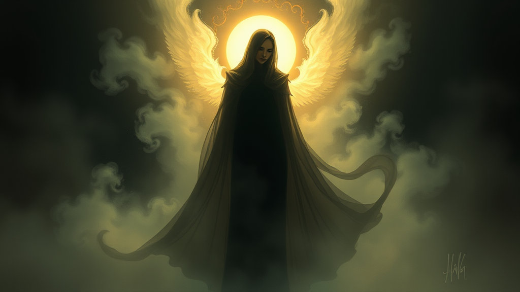 A solitary figure shrouded in ethereal mist, reminiscent of a ghostly presence, set against a deep, shadowy backdrop. This figure is illuminated by a bright, heavenly glow that casts an elegant aura around them. Their attire and poise exude an Art Nouveau charm, inspired by the graceful designs of Alphonse Mucha. The scene captures an essence of mystery and intrigue, akin to an iconic moment in a fantastical journey akin to One Piece. Rendered in a style that combines the bold, dynamic strokes of Artgerm with the detailed textures and atmospheric depth of Greg Rutkowski, this artwork stands out on Artstation as a trending masterpiece.